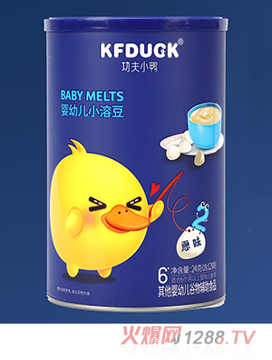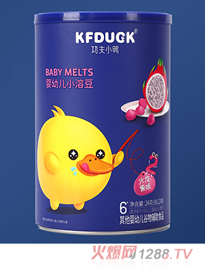 功夫小鴨嬰幼兒小溶豆系列,有獼猴桃味、香蕉胡蘿卜味、火龍果味、原味等,共四種口味,甄選食材,精湛制作,營養高度保留,入口即溶,好吃不膩。