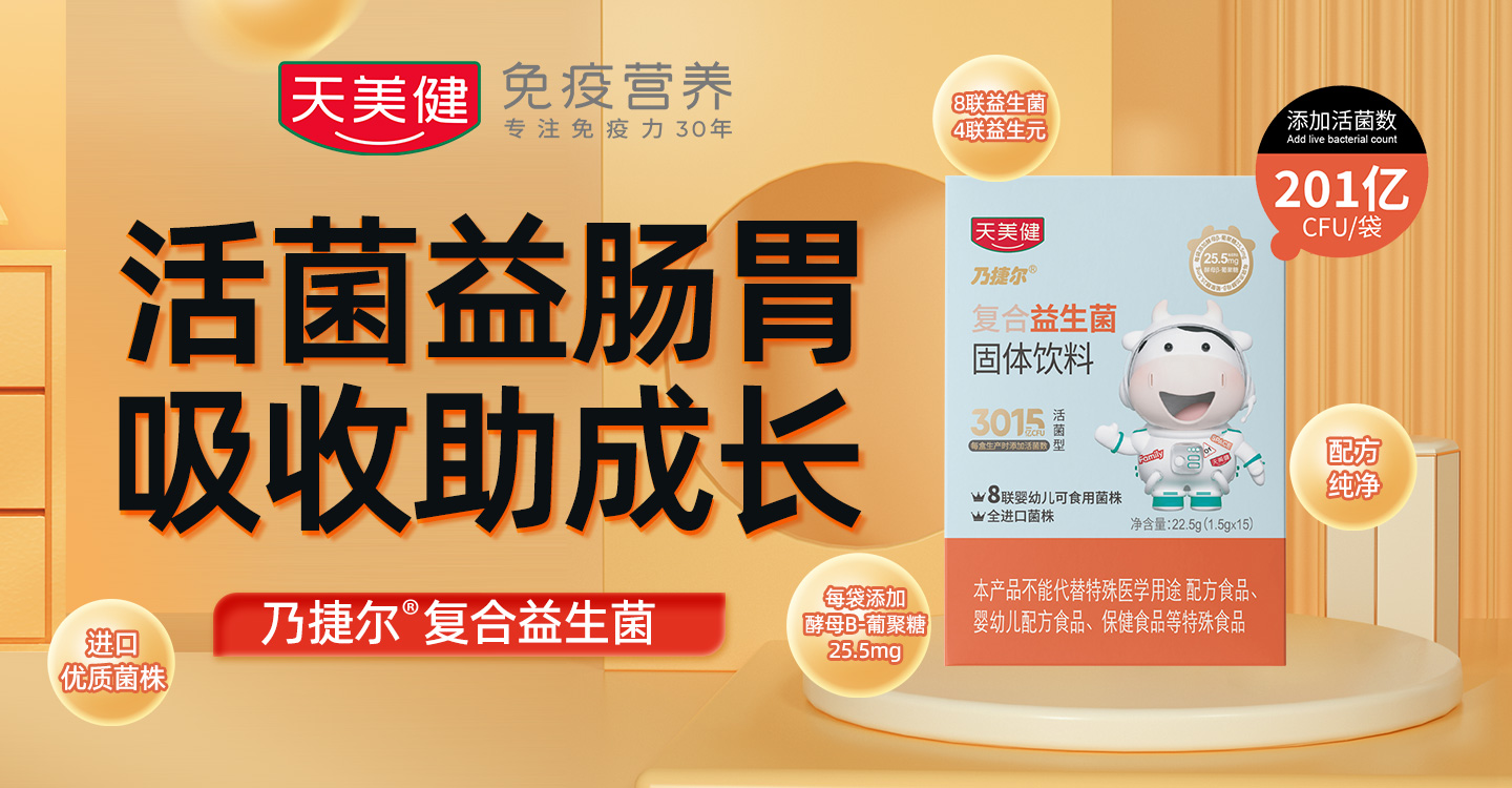 好營養助力好成長!天美健乃捷爾復合益生菌固體飲料強勢來襲,為成長精心守護,上市以來圈粉無數,深得消費者青睞,高品質彰顯!秉承品牌一貫的高品質、嚴要求,該款產品必將再掀訂貨狂潮,燃爆終端市場!