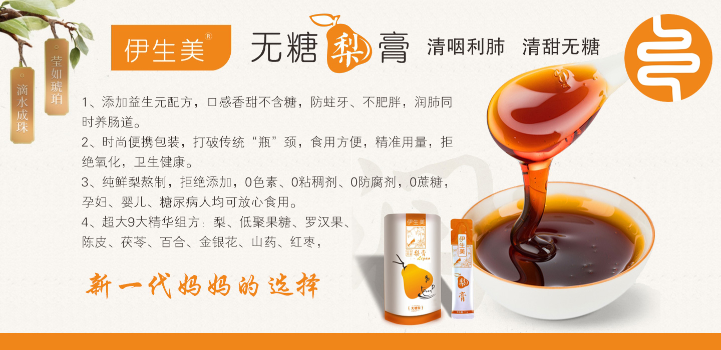 伊生美無糖梨膏甄選食材,以梨、低聚果糖、陳皮、羅漢果、茯苓、百合、金銀花、山藥、紅棗為主要原料,采用先進(jìn)的生產(chǎn)工藝制作,古方古法熬制而成,口感純正,清新怡人,不含糖,更健康。