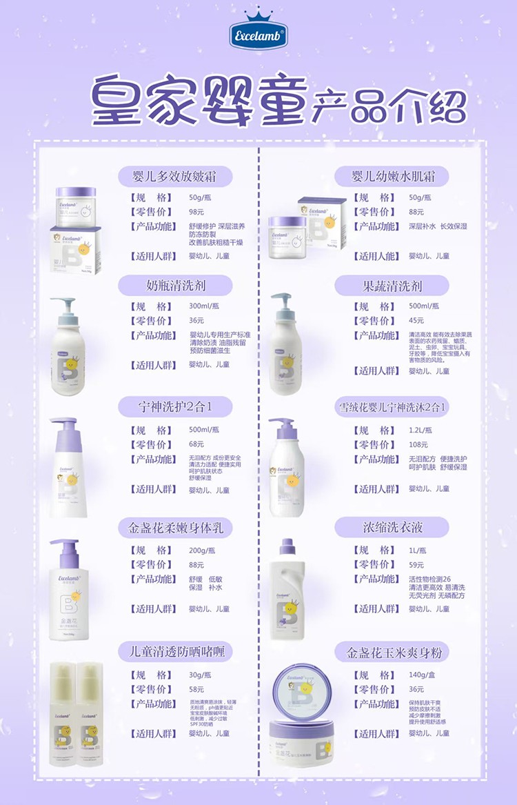 皇家嬰童,專注嬰童洗護領域,遵循寶寶發育期的肌膚特點和不同產品用途的具體差異,研制出有效的天然配方,更有效呵護寶寶幼嫩身體,給寶寶科學、細致周到的呵護,讓每一位寶寶都能尊享皇家般的貴族品質。