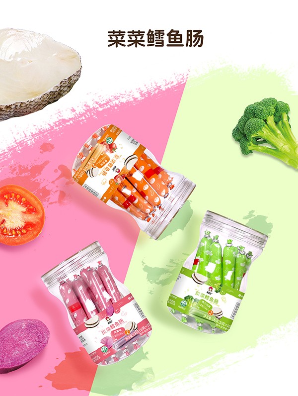 果蔬妃【菜菜鱈魚腸】創新融合蔬菜與鱈魚肉,鱈魚加蔬菜,營養更全面,色澤誘人,配方安全,促進寶寶成長發育,有番茄、西蘭花和紫薯三種口味可選!
