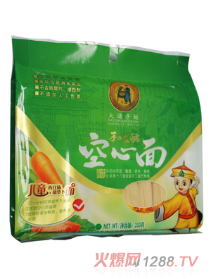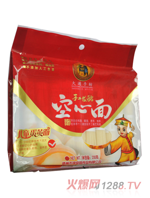 大通手紡系列面歷史悠久:康熙42年〔1703〕南巡。正月二十三日,國子監典簿孫叔詢攜眾家人從濟南府北上至山東禹城黃家坊恭迎圣駕。時至中午,君臣下塌禹城縣城內大通客棧,君臣把酒言歡,酒菜用罷,客棧掌柜親上自制手工空心面,帝觀之,條細如絲、空心如竹;甚是驚奇,嗅之,麥香純正、沁人心脾;品之,柔潤爽滑,入口即化;帝遂記于心。
